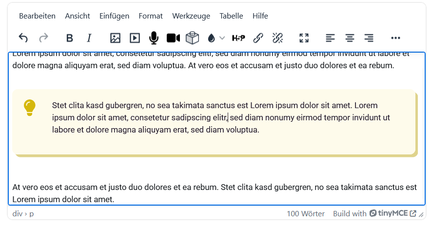 • Sofort wird die definierte CSS-Klasse auf den Text/Block angewendet und der Effekt (z. B. farbige Box) ist im Editor sichtbar.